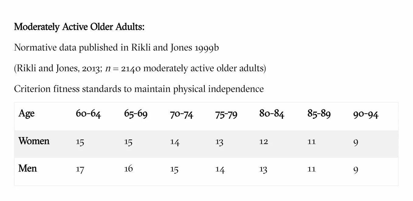 Normative Data: For those over 60, the goal is 15-17 reps in 30 seconds, performed safely. Please see table below as a reference.